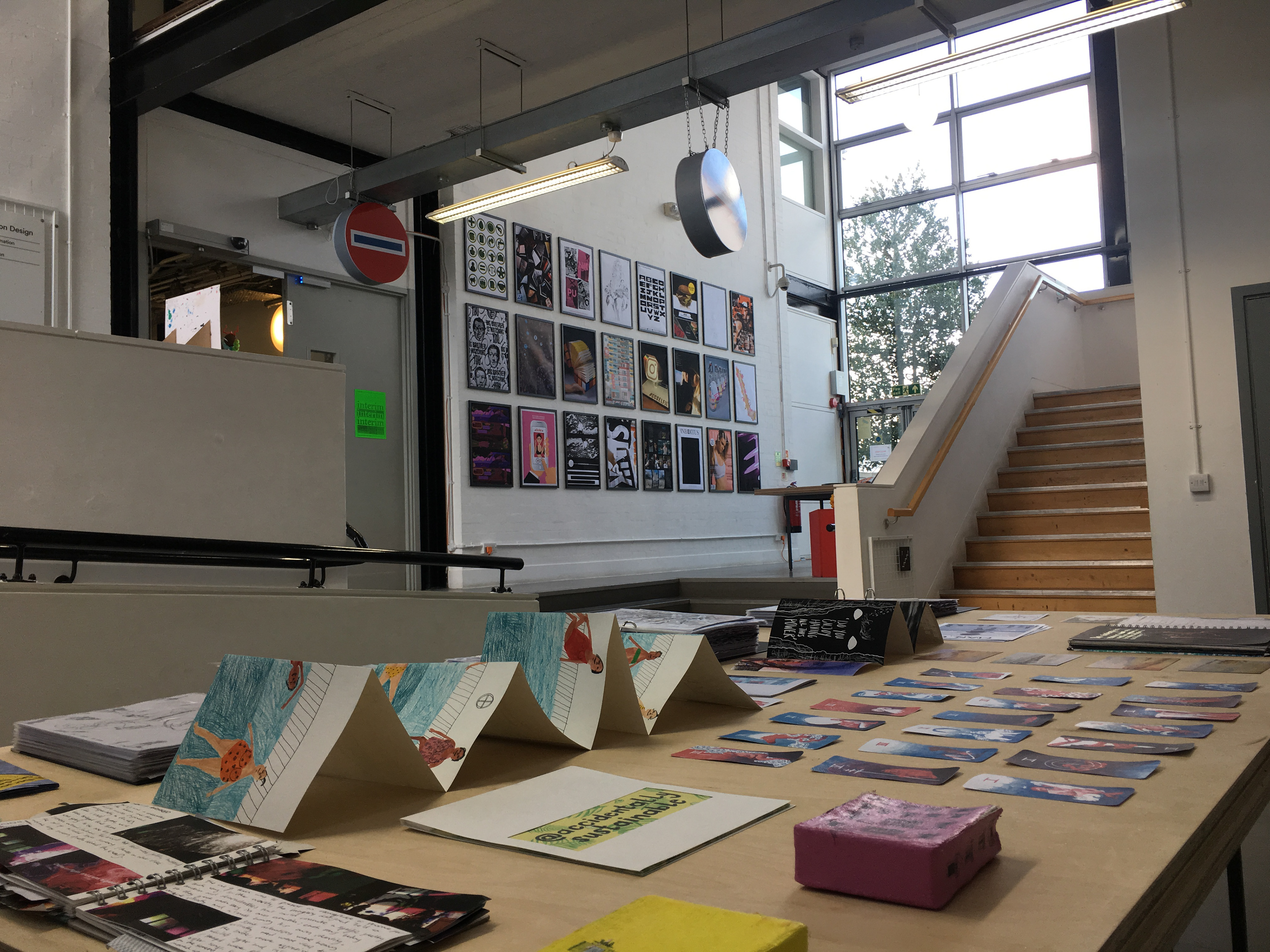 The Interim Show was a collective 'pop up' show where each student from Graphic Design and Illustration & Animation selected an image from their current project as well as (if applicable) a physical element to be framed and presented. The layout was designed to fill the empty space on the wall and create a wall of imagery, developing an exhibition in a 'non-exhibition' space.