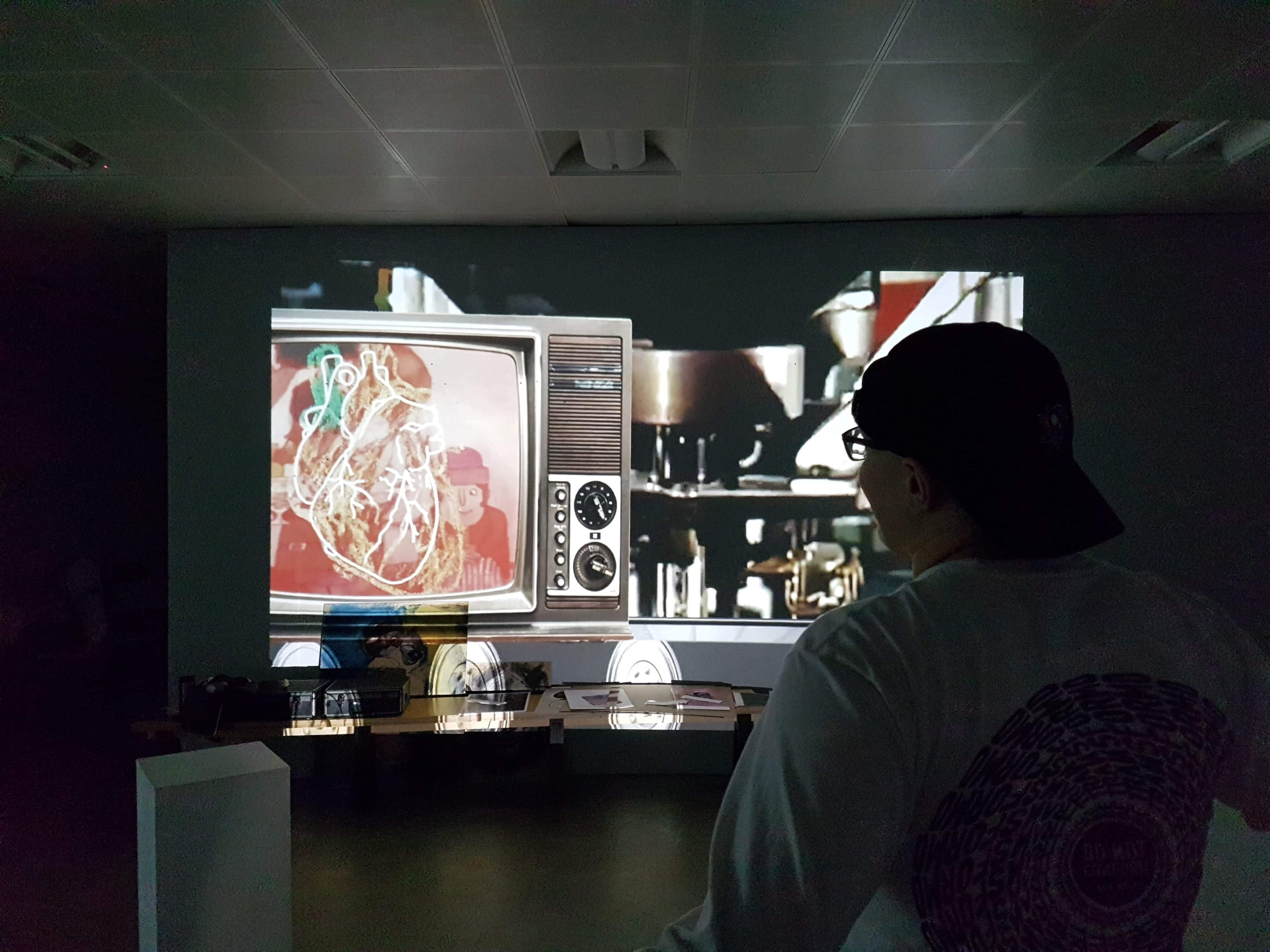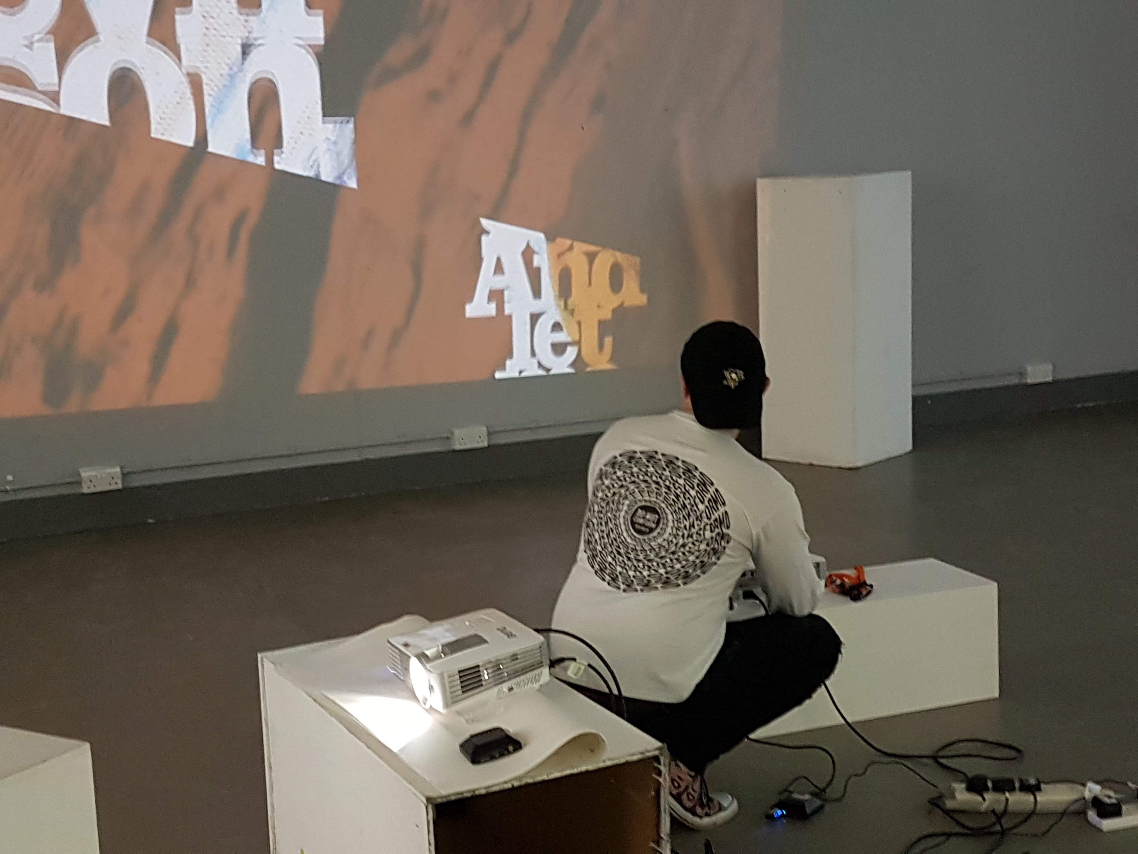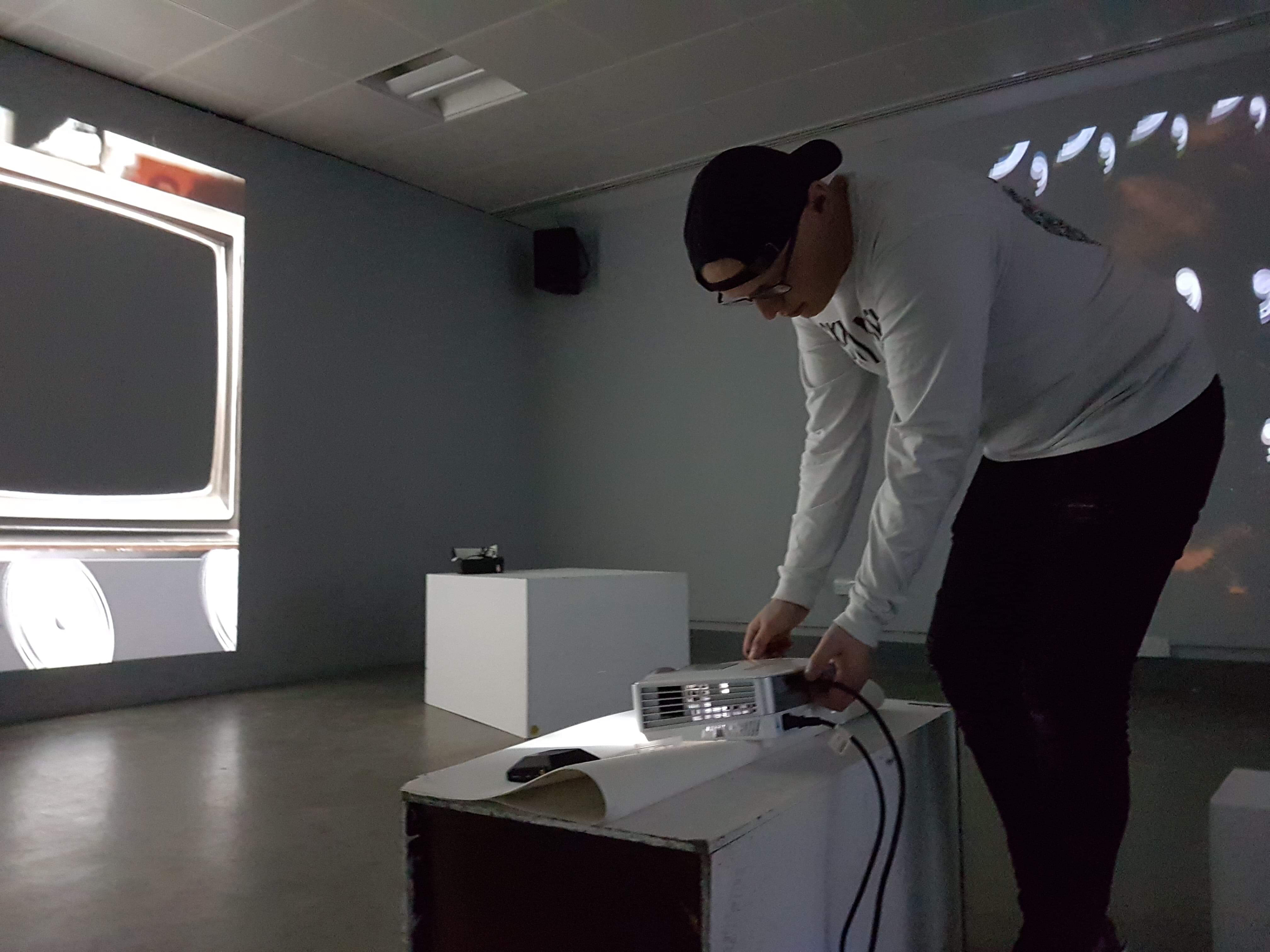 I got 4 projectors (1 on the ceiling and 3 based on the floor), 3 media boxes and 3 plinths (to hold the projectors and give them height). I positioned them in the centre of the room, each projector aiming at its own wall with a media box attached, containing a USB with the edited 32.50 film on. Ideally, I ideally needed a Raspberry Pi but there wasn't one about so I got two friends to help (and attempt) for us all to click the play button to each box at the same time for the films to match.